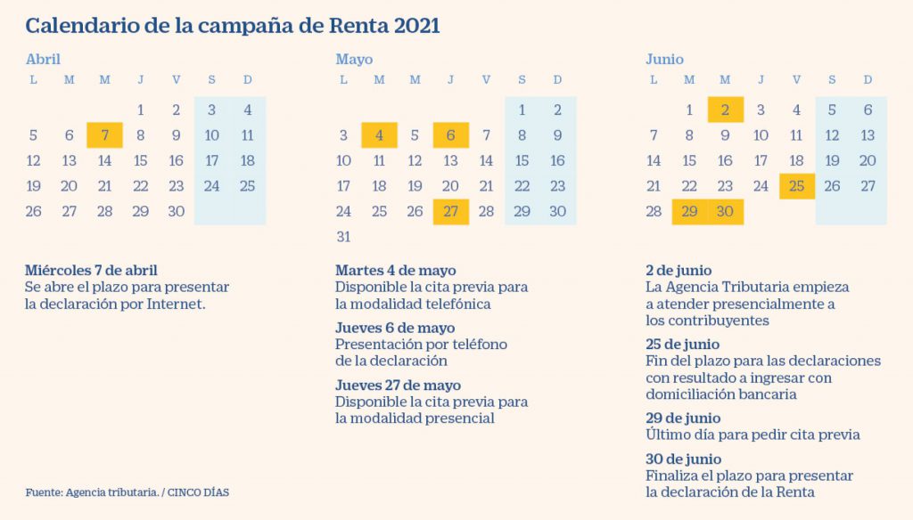 La campaña para presentar la declaración correspondiente al ejercicio 2019 arranca el próximo 7 de abril y finaliza el 30 de junio Apenas faltan ya dos meses para que comience la campaña de la Declaración de la Renta 2021, correspondiente al ejercicio 2020. Según el calendario de la Renta para el
