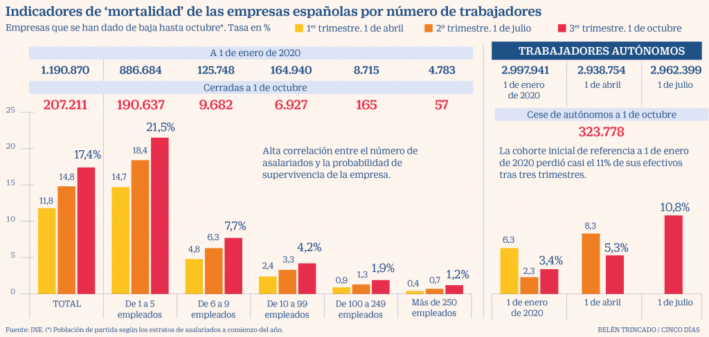 La tasa de supervivencia para las compañías con menos de cinco empleados cerró el tercer trimestre en el 78%, según el INE La crisis del Covid-19 se ha llevado por delante algo más de 207.000 empresas, una de cada seis, y ha obligado a echar el cierre a 323.000 autónomos,