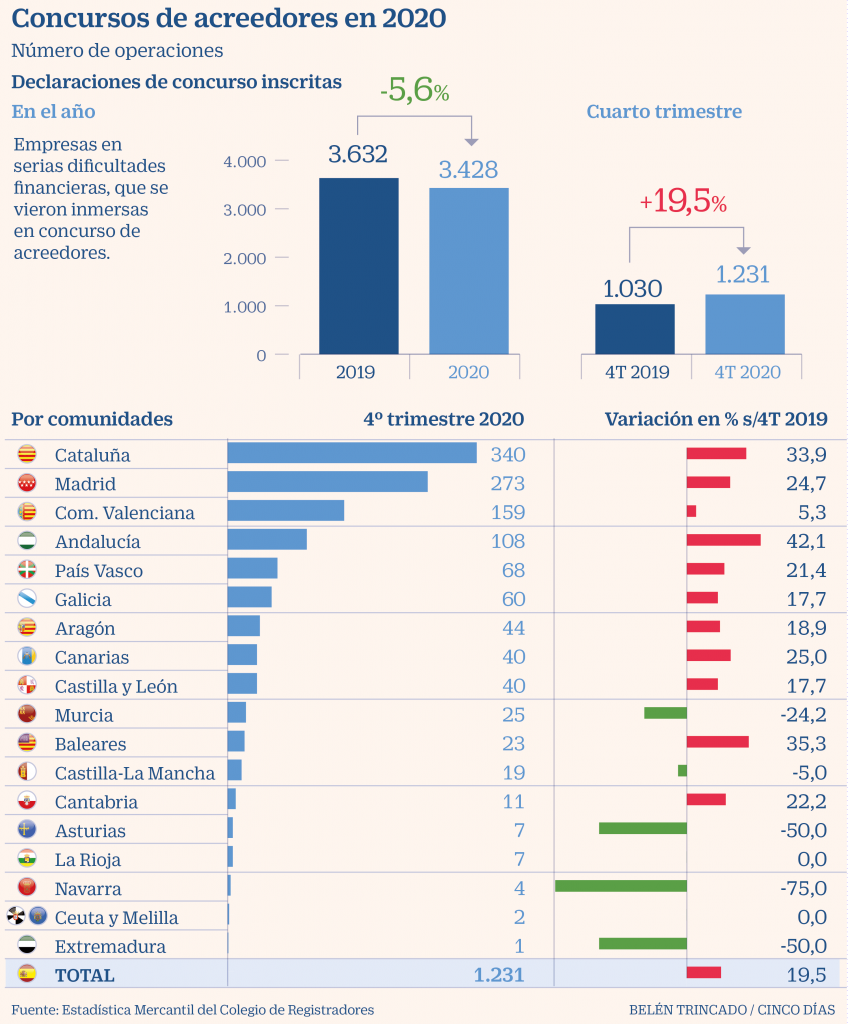 Los concursos se disparan un 20% al cierre de 2020 pese a la moratoria La patronal teme que la crisis del Covid se haga notar
